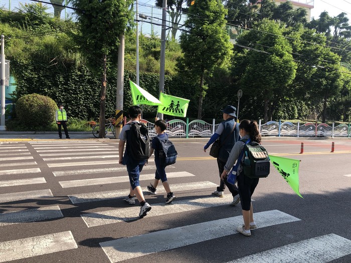 또한 등하교하는 초등학생들에게 노랑깃발을 들고 횡단보도를 건너도록 하여 보행자 안전을 스스로 확보할 수 있도록 지도하였다.