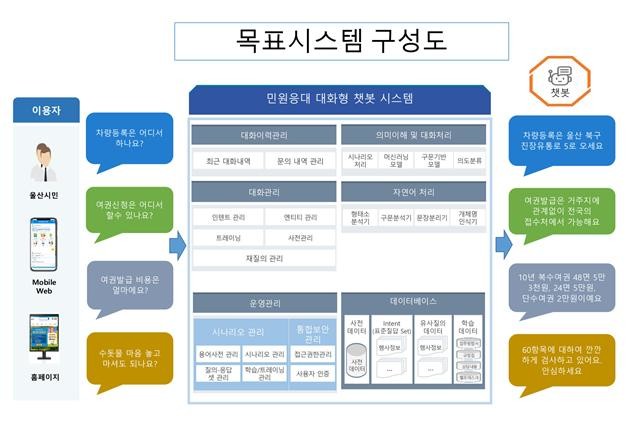 울산시는 인공지능(AI) 기술을 활용하여 실생활에서 자주 접하는 민원에 대하여 자동으로 24시간 상담해주는 ‘인공지능 기술 활용 민원상담 챗봇(채팅 로봇)서비스’를 구축한다.