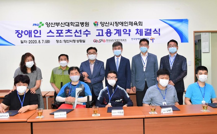 양산부산대학교병원은 지난 7일 양산시장애인체육회와 한국장애인고용공단 울산지사로부터 추천받은 장애인 스포츠선수 5명과 고용 계약 체결식을 가졌다. 이날 고용계약 체결식에는 선수 5명을 비롯해 김일권 양산시장(양산시장애인체육회장), 김대성 양산부산대학교병원장이 선수들의 내일을 응원하고자 참석했다.