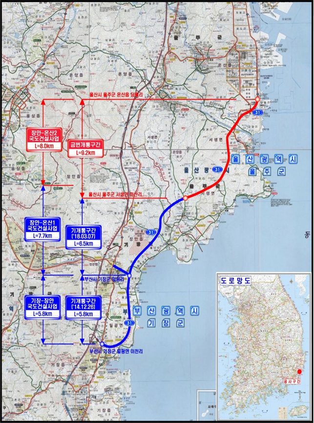 그간, 국도 31호선 부산-울산간 4차로 신설사업(21.5km, 5,259억원)은 부산 기장군 이천리∼임량리(5.8km, 1,248억원)구간의 ’14. 12월 개통을 시작으로,