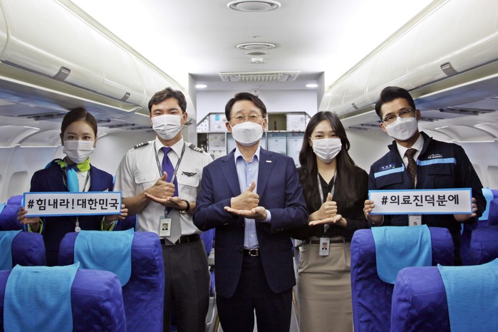 한태근 사장은 각 직군별 직원들과 함께 의료진에 대한 격려와 응원의 마음을 담은 수어 동작 사진을 에어부산 공식 인스타그램에 게재했다.