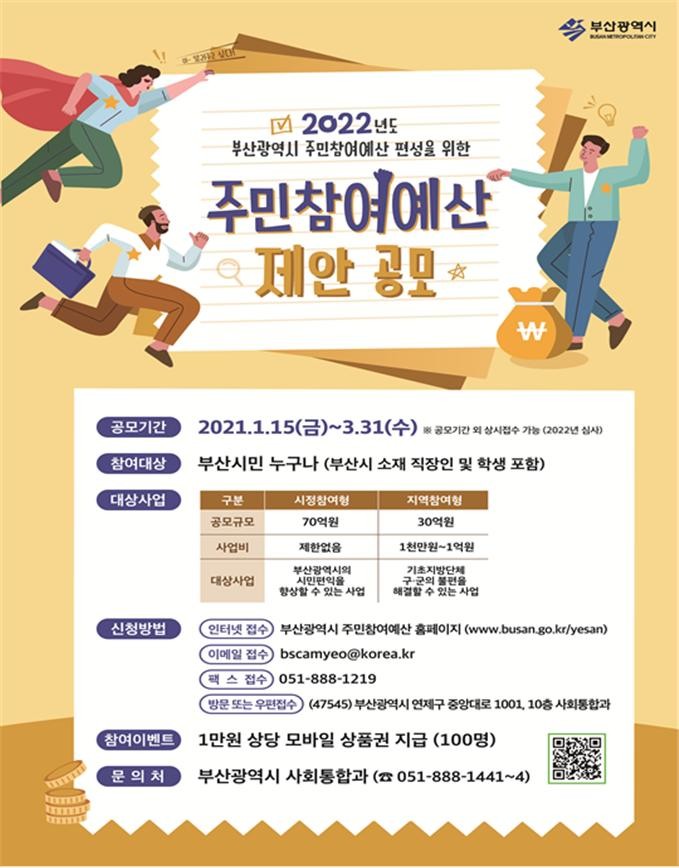 부산시(시장 권한대행 이병진)는 오는 3월 31일까지 2022년도 예산에 반영할 주민참여예산 제안 공모를 한다고 밝혔다.