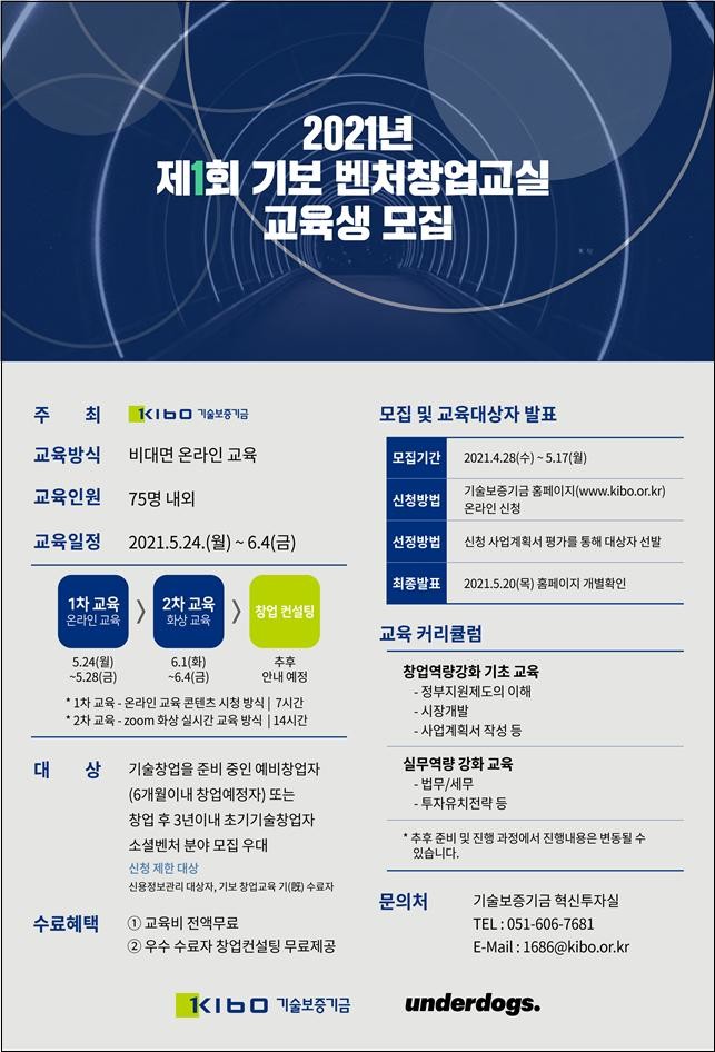 [부산=최성일 기자]기술보증기금(이사장 정윤모, 이하 ‘기보’)은 예비창업자 및 초기창업자의 성공창업 견인을 위해「2021년 제1회 벤처창업교실」교육생을 28일(수)부터 5월 17일(월)까지 모집한다고 밝혔다. 벤처창업교실은 5월 24일(월)부터 6월 4일(금)까지 비대면 온라인 교육으로 진행되며, 전액 무료 강좌이다.