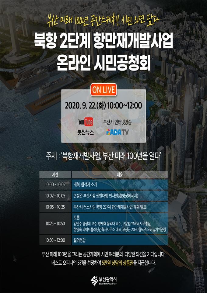 한편, 온라인 시민공청회는 오는 22일 오전 10시부터 ‘북항재개발사업, 부산 미래 100년을 열다’라는 주제로 부산시 공식 유튜브채널 ‘붓싼뉴스’에서 비대면으로 개최될 예정이다.