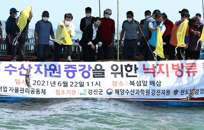 [강진=정찬남 기자] 전남 강진군 낙지주낙 자율관리 공동체는 지난 22일 사초리 복섬 인근 해상에서 수산자원 회복과 자원증강을 위한 낙지방류행사를 개최했다.
