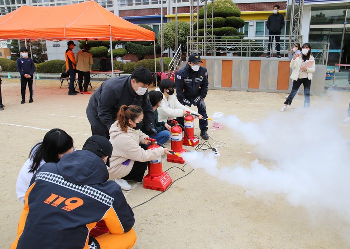 이날 교육은 방역 및 코로나19 감염예방수칙을 철저히 준수하며 이동안전체험차량을 이용해 지지체험, 연기피난체험, VR체험 등 각종 체험교육을 진행하였으며, 연기발생기를 사용한 소화기 체험과 심폐소생술· 응급처치교육도 병행하였다.
