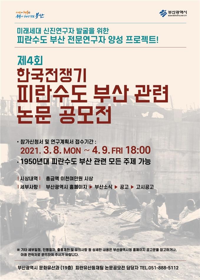 부산시(시장 권한대행 이병진)는 피란수도 부산유산의 세계유산 등재 추진에 대한 전국민적 관심을 진작시키고 ‘피란수도 부산’을 연구하는 미래 전문가를 발굴하기 위해 「제4회 피란수도 부산 논문공모전」을 개최한다고 밝혔다.