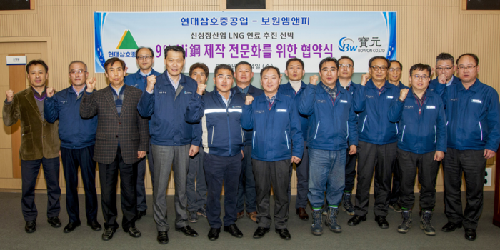 | 현대삼호중공업 생산본부장인 김형관 부사장과 보원엠앤피 대표이사인 마광식 회장 등 관계자들이 지난 4일 ‘신성장산업 LNG연료탱크 제작 전문화를 위한 협약서’에 서명하고 기념촬영하고 있다.(사진=현대삼호중공업) |