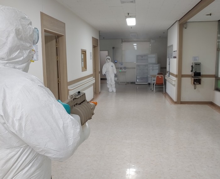 | 국립부곡병원에서 방역소독 작업을 하고 있다. |