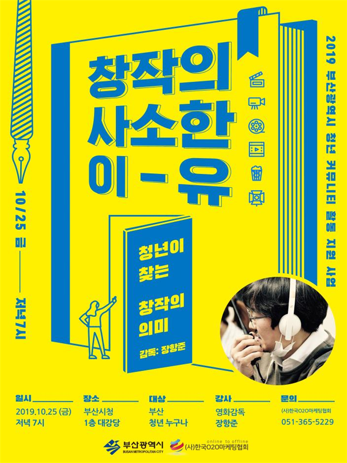 부산시(시장 오거돈)는 오는 25일 저녁 7시 시청 1층 대강당에서 장항준 영화감독과 함께하는 청년 특강 ‘창작의 사소한 이유’를 개최한다고 밝혔다.