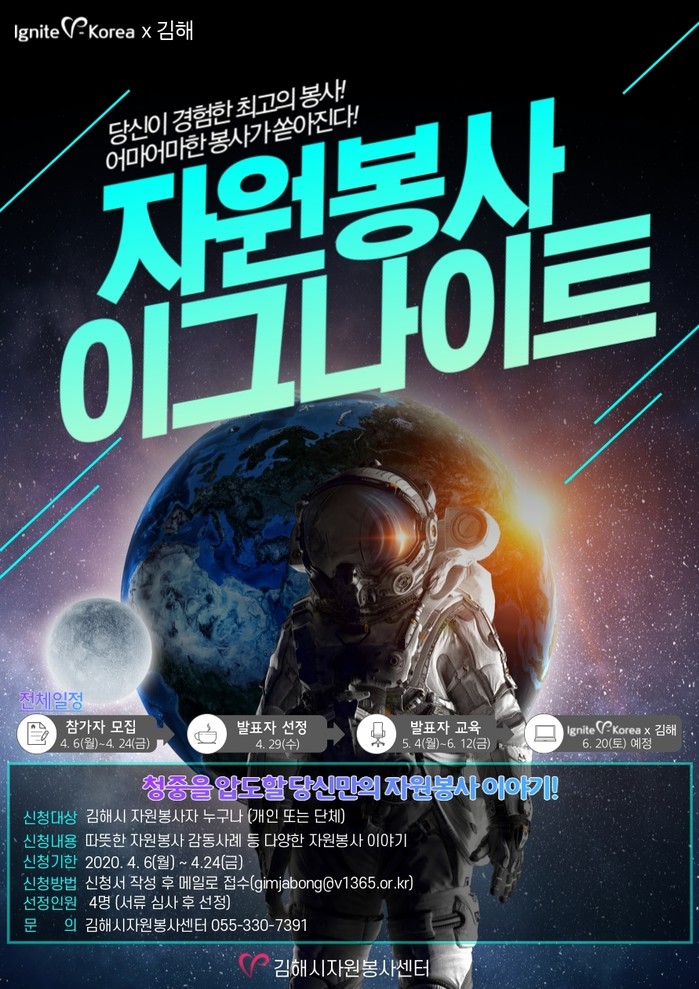 ‘자원봉사 이그나이트 V-Korea × 김해’는 관내 자원봉사자면 누구나 신청 가능하며, 발표자로 선정되면 5월 중 진행되는 교육을 통해 PPT 작성, 스피치 교육 등 발표를 위한 사전교육을 받게 된다.