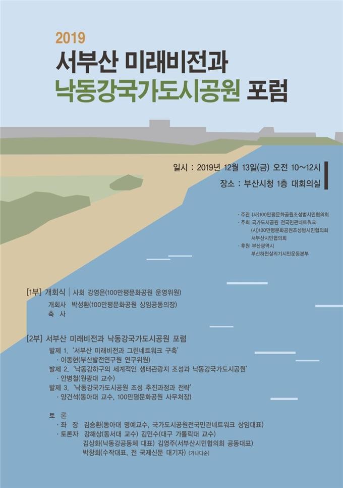 12월 13일 10시 부산시청 1층 대회의실에서 개최되는 『서부산 미래비전과 낙동강국가도시공원 포럼』에서는 부산발전연구원 이동현 위원이 『서부산 미래비전과 그린네트워크 구축』을, 원광대 안병철 교수가 『낙동강하구의 세계적인 생태관광지 조성과 낙동강국가도시공원』을, 동아대 양건석 교수가 『낙동강국가도시공원 조성 추진전략』을 각각 주제로 발표하고 이에 대한 시민과 전문가들의 의견을 듣는다.