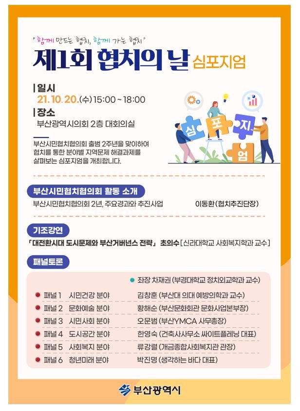 부산시(시장 박형준)가 내일(20일) 오후 3시 부산광역시의회 2층 대회의실에서 ‘제1회 협치의 날 심포지엄’을 개최한다고 밝혔다.
