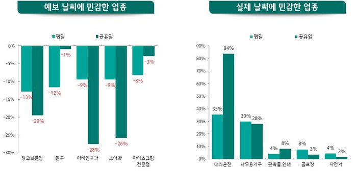 그리고 업종별로 기상 예보와 실제 날씨에 각각 다르게 반응한 것으로 나타났는데, 대리운전이나 여객선 등은 실제 날씨에 민감하게 반응했고, 예약위주인 숙박업소나 종합병원, 출장연회 등은 기상 예보에 민감한 것으로 나타났다. 반면 필수재나 일상 생활에서 잦은 소비를 하는 주유소, 편의점, 커피전문점 등의 매출은 실제 날씨나 기상 예보에 덜 민감한 것으로 나타났다.
