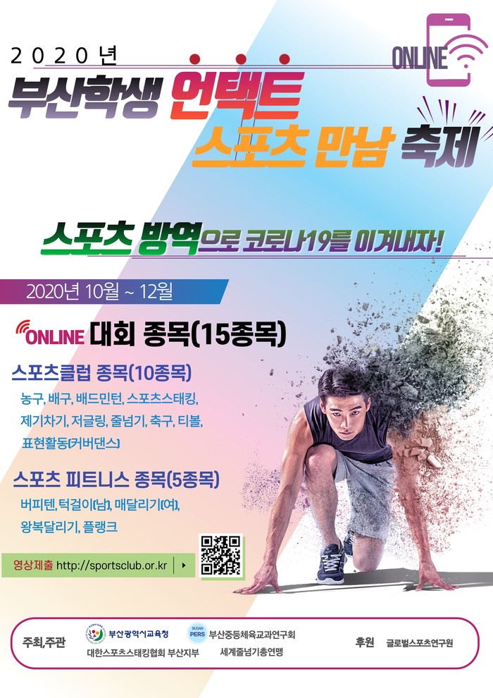 부산광역시교육청(교육감 김석준)은 10월 12일부터 12월 24일까지 학생들의 안전 및 체력 증진을 위해 부산지역 초·중·고등학교를 대상으로 ‘2020 부산학생 언택트 스포츠 만남 축제’를 개최한다.