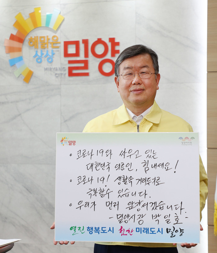 박일호 밀양시장은 지난 6일 코로나19로 어려움을 겪고 있는 국민과 의료현장의 최전선에서 헌신하는 의료인, 방역당국 관계자들에게 희망과 용기를 전하기 위해 희망 메시지 캠페인에 참여했다.