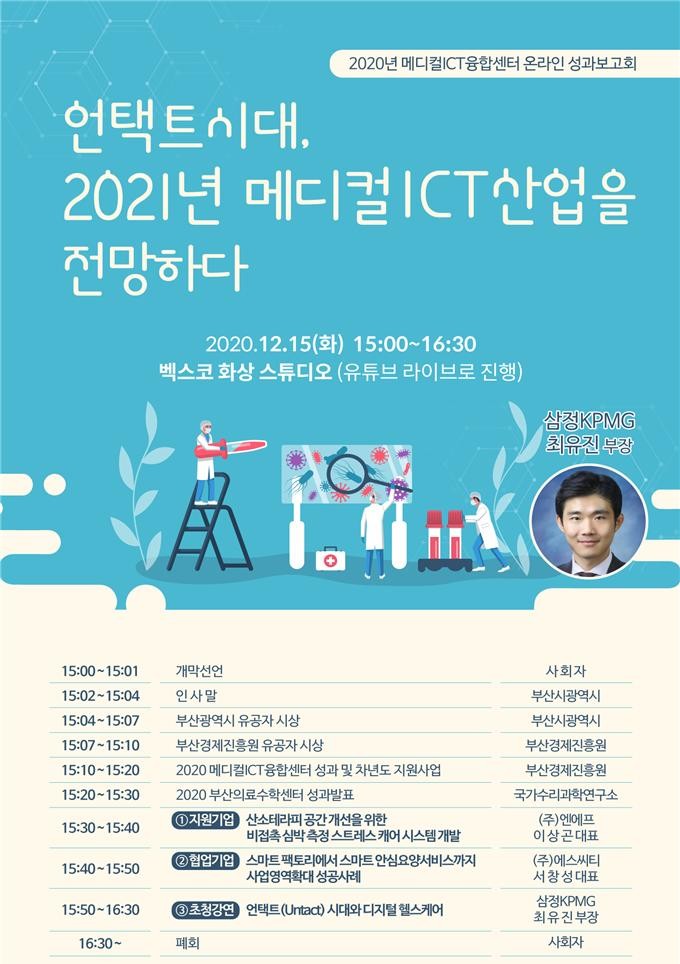 부산시(시장 권한대행 변성완)는 부산경제진흥원과 함께 12월 15일 오후 3시부터 「2020년 메디컬ICT융합센터 성과보고회」를 온라인으로 개최한다고 밝혔다.