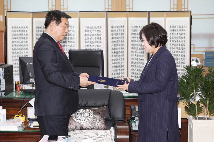 | ▲ 조영훈 의장이 이화묵 부의장을 책임검사 위원으로 위촉하고 위촉장을 전달하고 있다.(사진제공=중구의회) |
