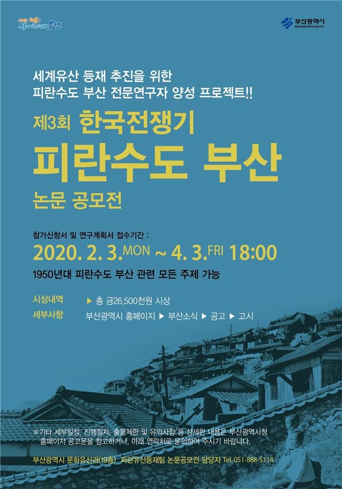 부산시(시장 오거돈)는 최근 근현대 유산에 대한 인식변화와 함께 새로운 역사주제로 주목을 받고 있는 ‘피란수도 부산’을 연구하는 미래 전문가 찾기 프로젝트의 일환으로 올해 3번째로 피란수도 부산 논문공모전을 개최한다고 밝혔다.