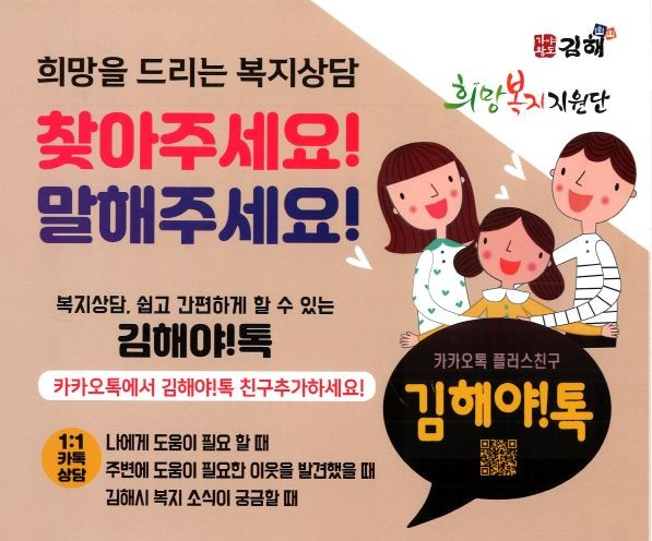 김해시는 익명으로 복지 상담이 가능한 카카오톡 ‘김해야! 톡’을 적극 홍보해 복지사각지대를 발굴한다고 밝혔다.
