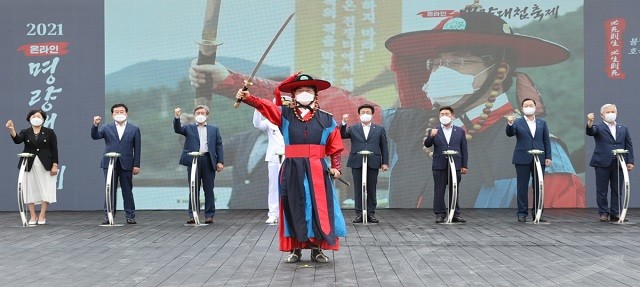 [해남=정찬남 기자] 2021 명량대첩축제가 3일 해남 우수영 충무사에서 열린 약무호남제례를 시작으로 5일까지 3일간 비대면 방식으로 개최되고 있다.