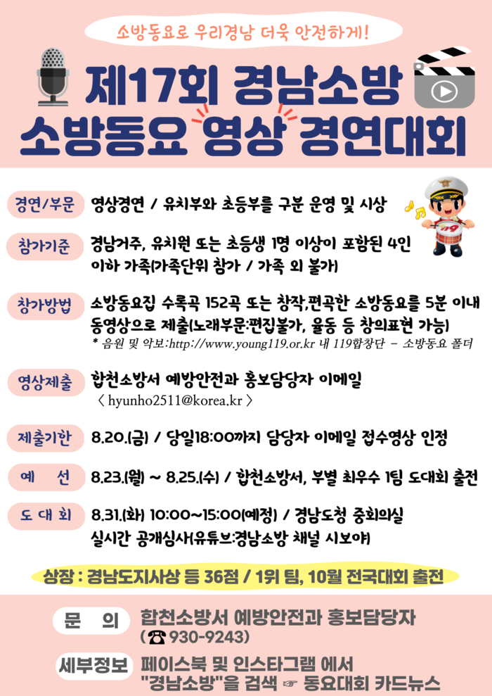 합천소방서(서장 김진옥)는 8월 31일 개최되는 ‘경남 소방동요 영상 경연대회’ 참가자를 모집한다고 밝혔다.