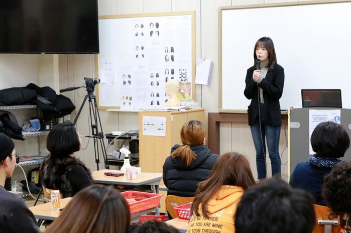 | ▲ 선배 멘토로 교육원을 방문한 이기윤 헤어디자이너가 인사말을 하고 있다. |