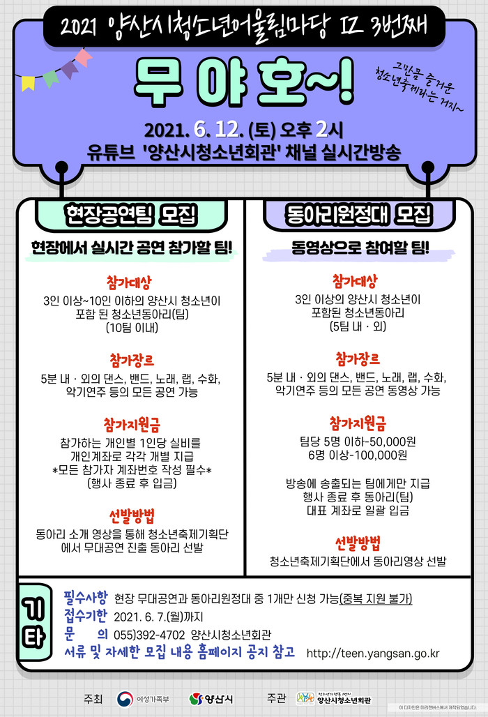 언제나 즐거운 2021 양산시청소년어울림마당IZ 세 번째 이야기 [무야호~!]가 오는 12일(토) 오후 2시 유튜브‘양산시청소년회관’공식 채널에서 실시간 온라인 방송으로 청소년과 시민을 찾아간다.