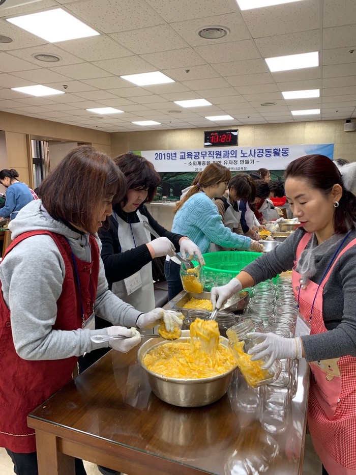 이날 교육공무직원과 관리과 직원들은 직접 유자청을 만들어 부산진구 전포2동과 부암1동 주민센터를 통해 소외된 이웃에게 유자청 100병을 기부하는 뜻깊은 행사를 펼쳤다.