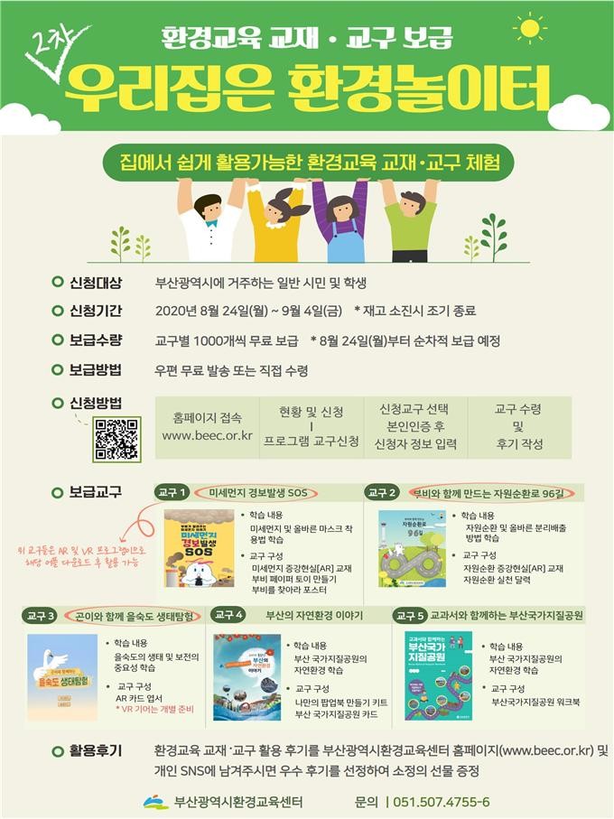 교재와 교구 무료신청은 내달 4일까지 부산시환경교육센터 홈페이지(https://beec.or.kr/)에서 할 수 있다. 신청 수량은 한 가정당 교재·교구별 1세트씩이며 신청 즉시 당일 무료배송이 진행된다. 부산시는 총 5,000세트를 보급할 예정이다.