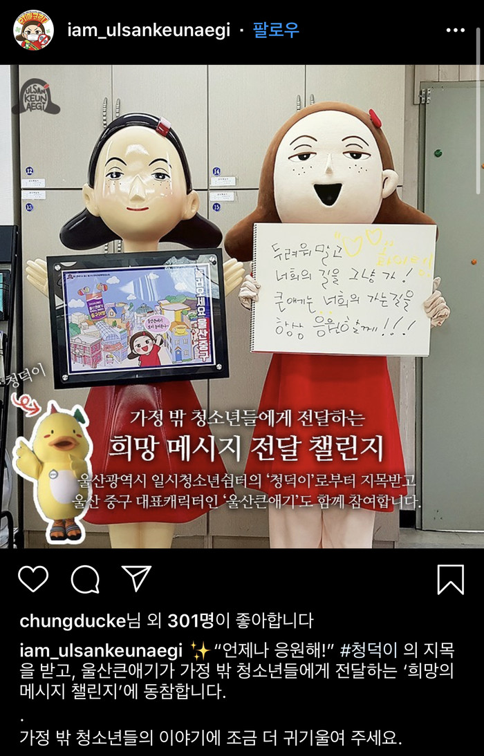 울산시가 여름방학을 맞아 지난 8월 8일부터 9월 6일까지 ‘2020년 여름방학 전국 청소년쉼터 연합아웃리치’의 일환으로 누리소통망(SNS)을 통해 실시한 희망메시지 전달 챌린지 ‘#청덕아사랑해’가 큰 호응을 얻었다.