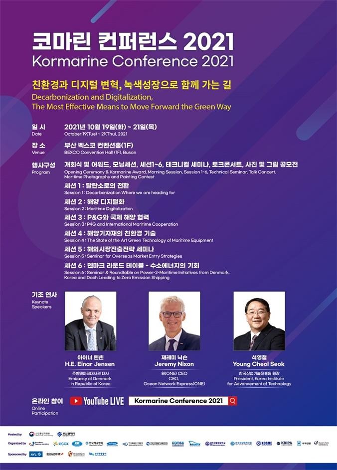 그리고 기조 강연은 ▲아이너 얀센 주한 덴마크 대사의 ‘친환경과 디지털 변혁, 녹생성장으로 함께 가는 길’ ▲제레미 닉슨 ONE대표이사의 ‘해운정책과 해운시장의 흐름 및 디지털 해운’ ▲석영철 KIAT원장의 ‘조선해양기자재업체의 국책사업 선정과 수행까지 과정의 향후 발전 전략 모색’ 등이다.