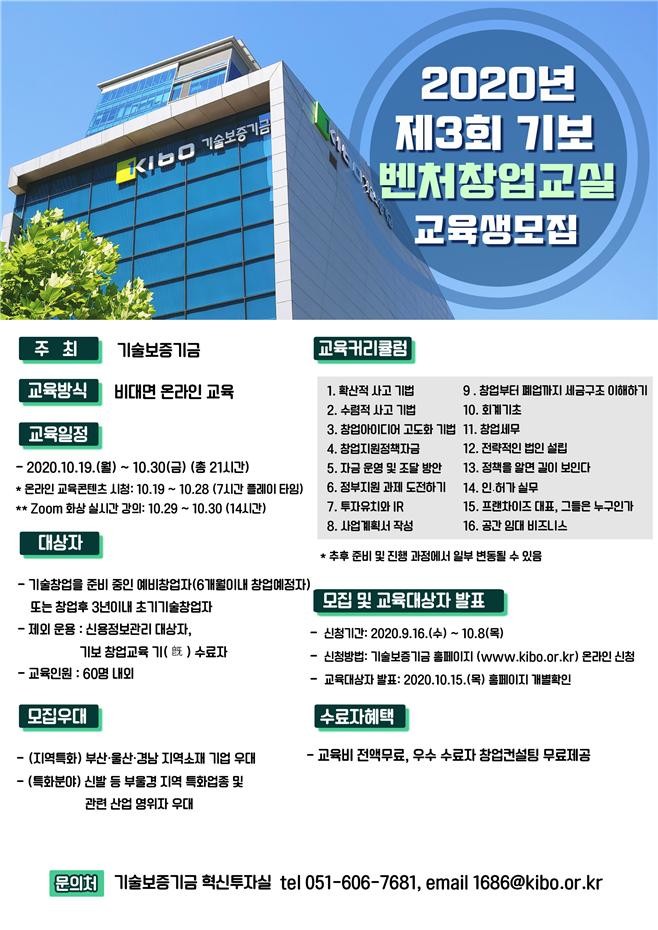[부산=최성일 기자]기술보증기금(이사장 정윤모, 이하 ‘기보’)은 예비창업자 및 초기창업자의 성공창업 견인을 위해「2020년 제3회 벤처창업교실」교육생을 오늘(16일)부터 10월 8일(금)까지 모집한다고 밝혔다.