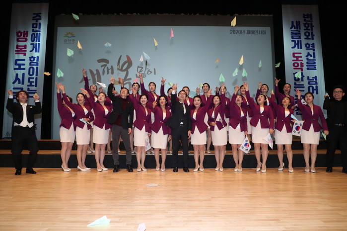 금천구가 지난 10일 오후 4시 구청 금나래아트홀에서 구민과 함께 행복도시 금천으로의 도약을 다짐하는 ‘2020년 새해 인사회’를 개최했다. 사진은 새해 인사회에서 유성훈 구청장(앞줄 가운데)과 참석자들이 새해소망을 적은 종이비행기를 날리고 있는 모습.(사진제공=금천구청)