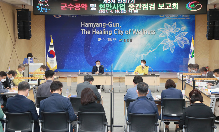 군은 지난 4월30일 군청 대회의실에서 서춘수 군수, 해당 부서장 등 40여명이 참석한 가운데 ‘제5차 민선7기 군수 공약사업 추진상황 중간점검 보고회’를 개최하고 공약사업 추진상황을 점검했다.