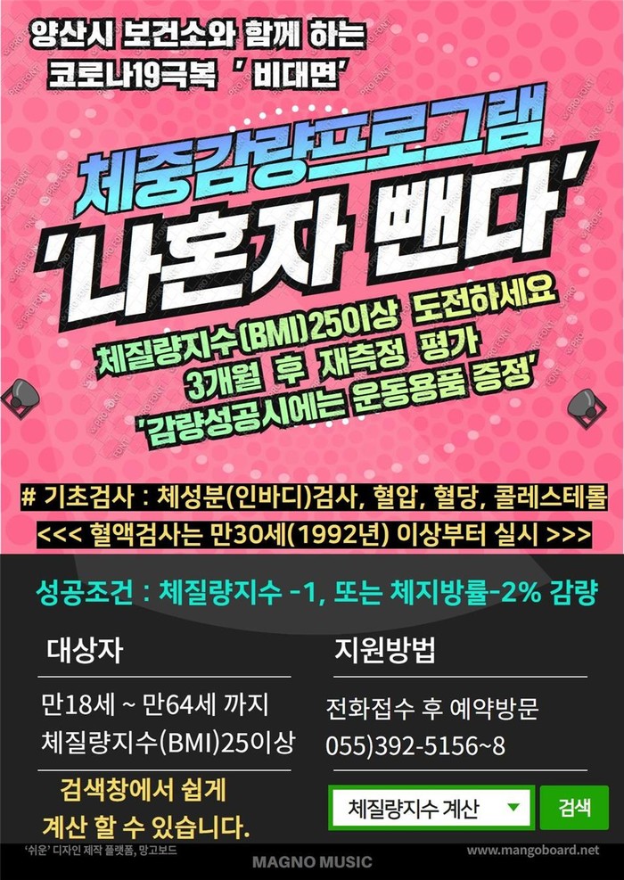 만18세 ~ 만64세 중 체질량지수(BMI) 25Kg/㎡ 이상인 양산시민이면 누구나 참여 가능하고 양산시보건소 1층 건강증진실(☎392-5156~5158)로 전화접수 후 방문하면 된다.