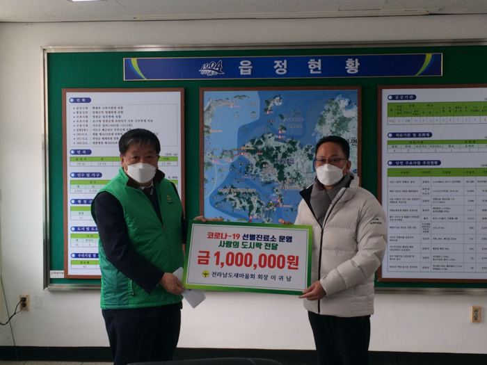 [신안=황승순 기자] 전라남도 새마을회와 신안군 새마을회는 지난 18일 코로나19 극복에 힘쓰고 있는 지도 선별진료소 근무자와 지도읍 직원들에게 격려금을 전달했다.