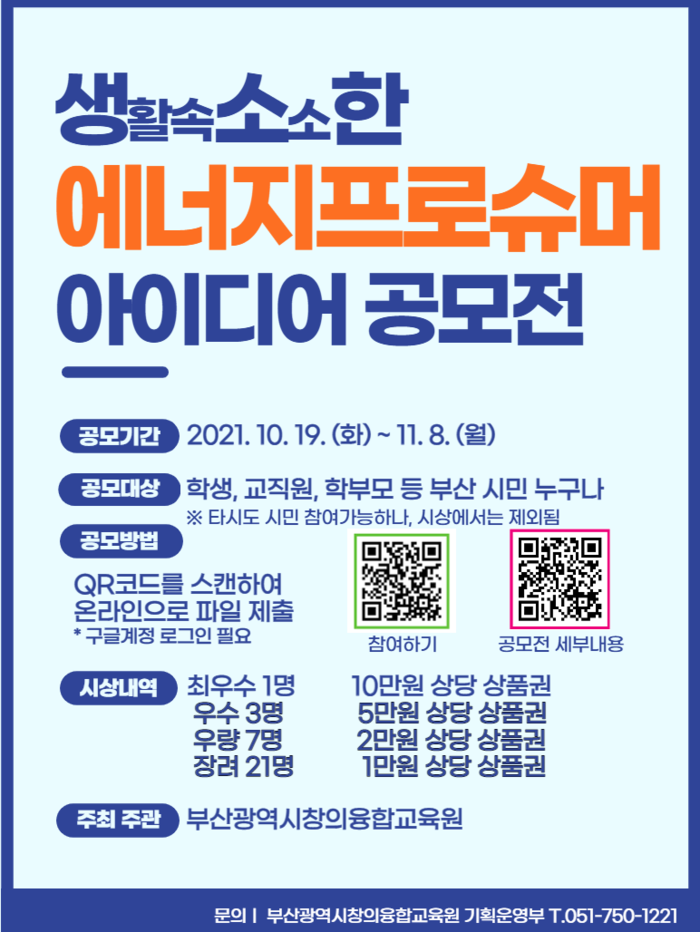 부산광역시창의융합교육원(원장 이연행)은 10월 19일부터 11월 8일까지 시민을 대상으로 ‘생(활속)소(소)한 에너지 프로슈머’ 아이디어 공모전을 실시한다.