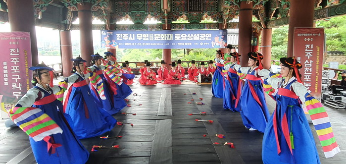 토요상설공연은 8월부터 10월까지 매주 토요일 촉석루에서 개최되며 국가무형문화재 진주삼천포농악, 진주검무와 도지정무형문화재 진주포구락무, 신관용류 가야금산조, 진주오광대 등 의 보유자, 이수자 80여명이 출연했다.
