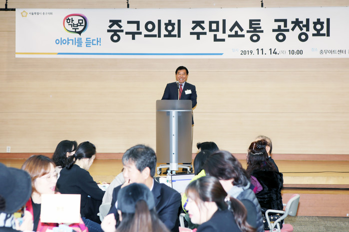 [시민일보 = 여영준 기자] 서울 중구의회(조영훈 의장)가 지난 14일 충무아트센터 컨벤션홀에서 주민소통 공청회를 개최했다.