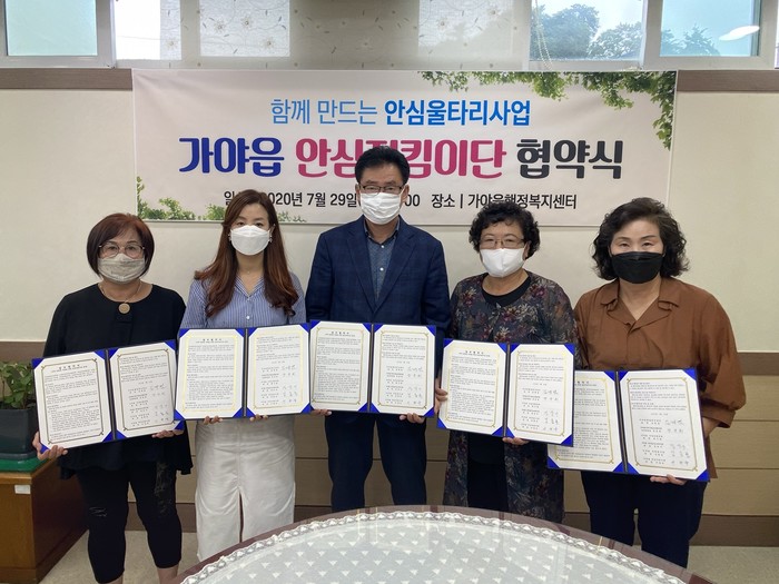 함안군 가야읍은 지난 7월 29일 가야읍지역사회보장협의체, 가야읍새마을부녀회, 가야읍새마을지도자회, 가야읍자원봉사대, 가야읍이장단협의회 등 5개 민간단체와 ‘가야읍 안심지킴이단 업무협약’을 체결했다.