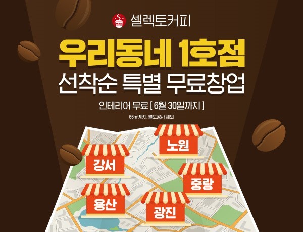 셀렉토커피 가맹본부 관계자는 이번 우리동네 1호점 프로모션에 대해 “어려운 시기에 창업을 고민하는 이들을 지원함과 동시에 장기적으로 성공창업이 가능한 가맹점을 늘려나가려는 것이 이번 프로모션의 목표”라며, “시작은 서울지역 5개 구를 중심이지만, 향후 점차적으로 지역을 확대해나갈 계획”이라고 전했다.