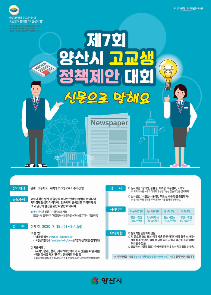 양산의 미래를 이끌 고등학생들의 시정에 대한 관심을 높이고, 학생 특유의 참신하고 독특한 아이디어를 발굴하기 위해 양산시가 제7회 양산시 고교생 정책제안대회 ‘신문으로 말해요’를 진행한다.