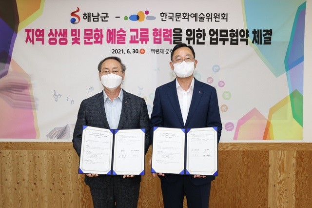 [해남=정찬남 기자] 전남 해남군과 한국문화예술위원회가 지역 상생 및 문화 예술 교류 협력을 위한 업무 협약을 체결했다.