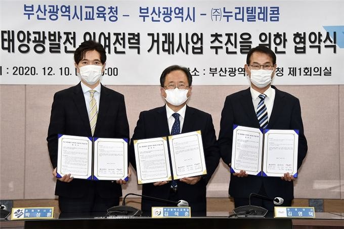 부산시(시장 권한대행 변성완)는 부산시교육청, 민간투자사업자(㈜누리텔레콤)와 함께 부산지역 학교에 설치된 태양광 발전설비에서 생산되는 잉여전력 거래를 추진하기 위해 지난 10일 오후 3시 부산시교육청에서 ‘학교 태양광발전 잉여전력 거래사업’ 업무협약을 체결했다고 밝혔다.