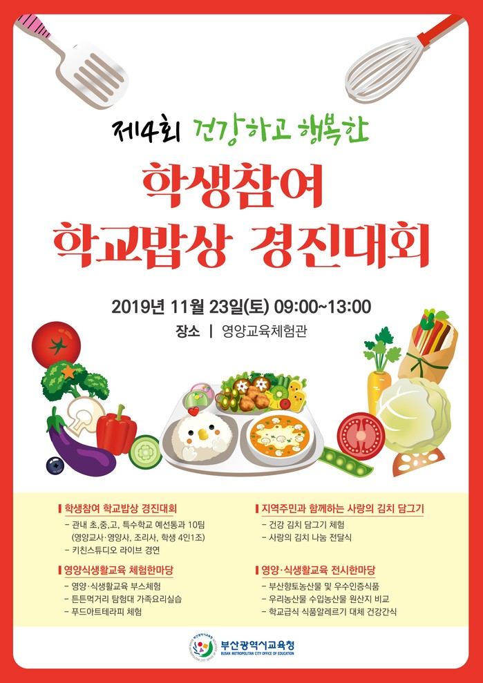 부산광역시교육청(교육감 김석준)은 오는 11월 23일 오전 9시부터 오후 1시까지 금정구 회동마루 영양교육체험관에서‘제4회 학생참여 학교밥상 경진대회 및 영양‧식생활교육체험 한마당’을 개최한다