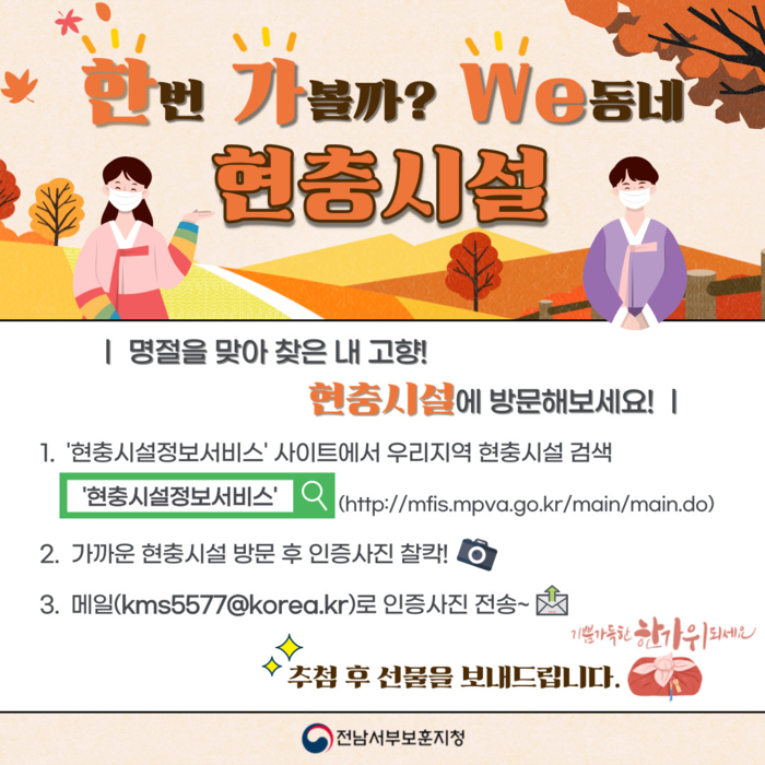 전남서부보훈지청(지청장 유형선)은 추석연휴를 맞이하여 고향을 찾는 귀성객들을 대상으로 지역의 현충시설에 방문하는 이벤트를 진행한다고 밝혔다.