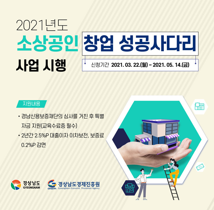 [창원=최성일 기자] 경상남도(도지사 김경수)는 소상공인의 성공적인 창업과 안정적인 사업 정착을 위하여 ‘2021년 소상공인 창업성공사다리 사업’을 경상남도 경제 진흥원에 위탁 시행한다고 밝혔다.