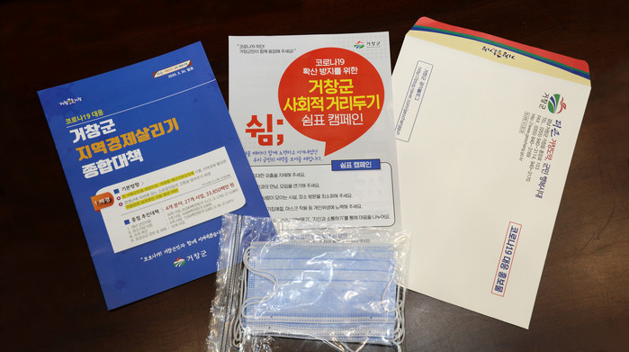 거창군(구인모 군수)은 의료진이 사용하는 덴탈마스크 15만매를 우선 구매해 전 군민 1인 2매와 함께 대 군민 서한문, 사회적거리두기 홍보물, 경제살리기 종합대책 자료를 담아 전 군민(61,822명)들에게 우편 발송했다고 8일 밝혔다.