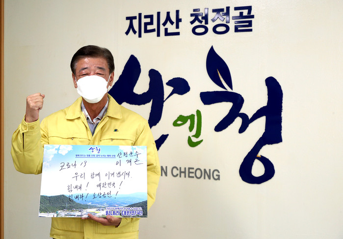 이재근 산청군수가 11일 ‘코로나19 극복을 위한 희망 캠페인’ 릴레이에 동참했다.